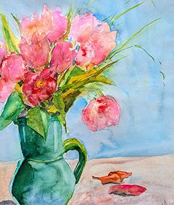 Als ich zu malen begann, war ich ganz versessen und habe jeden den Strauß auf meinem Tisch abgemalt. So sind unendlich viele Blumenbilder entstanden. Da ich inzwischen meistens ganz andere Motive male, möchte ich meine Schubladen leeren und gebe auf dieses Genre Rabatte.